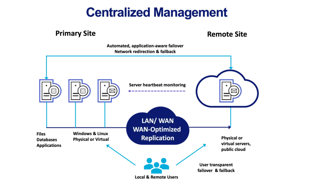Az Arcserve RHA szoftver szinkronizálja a Windows és Linux rendszereiden lévő adatokat egy második, általad kialakított fizikai vagy virtuális rendszerrel, amely lehet helyben, távoli helyszínen vagy a felhőben.